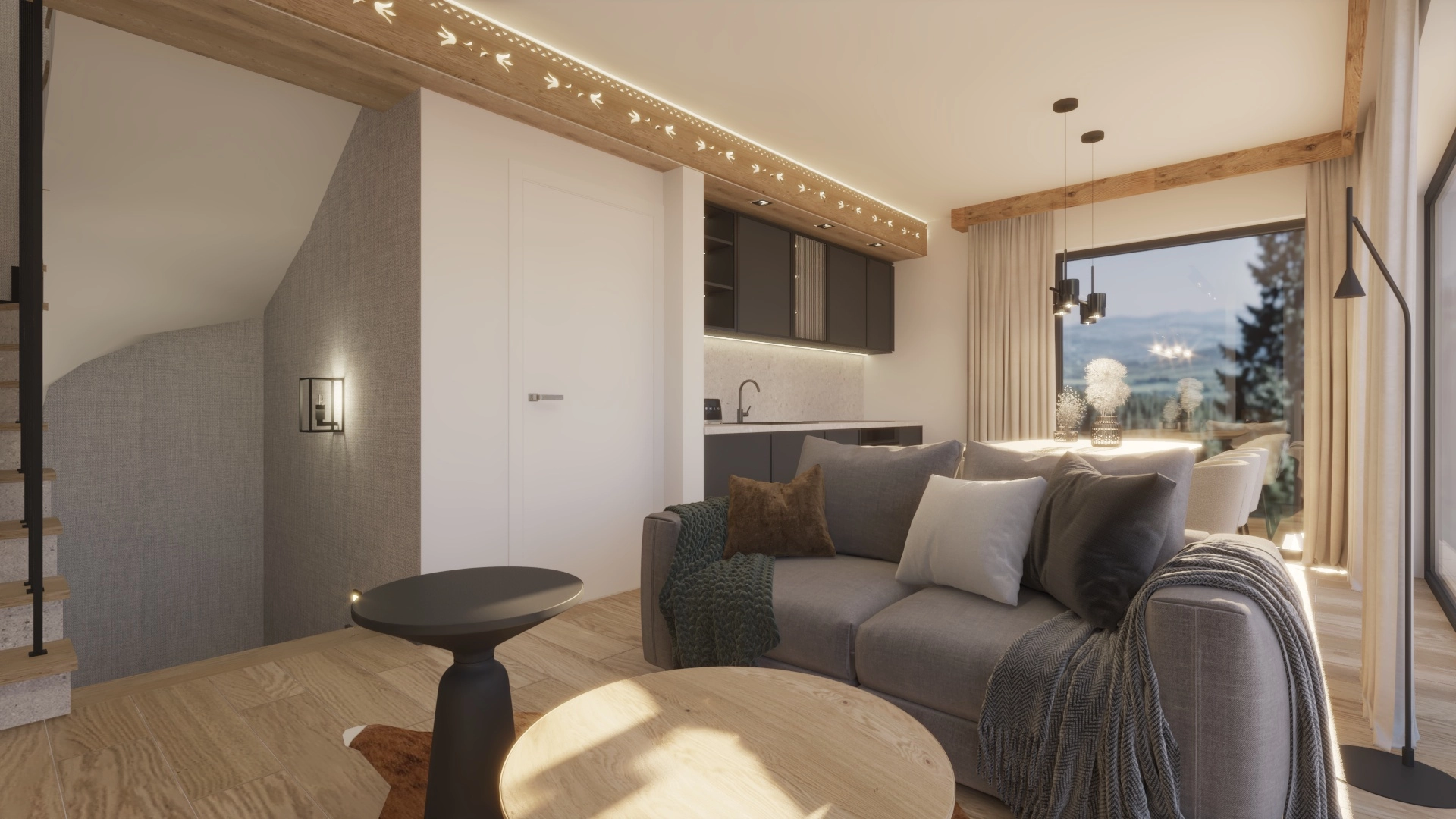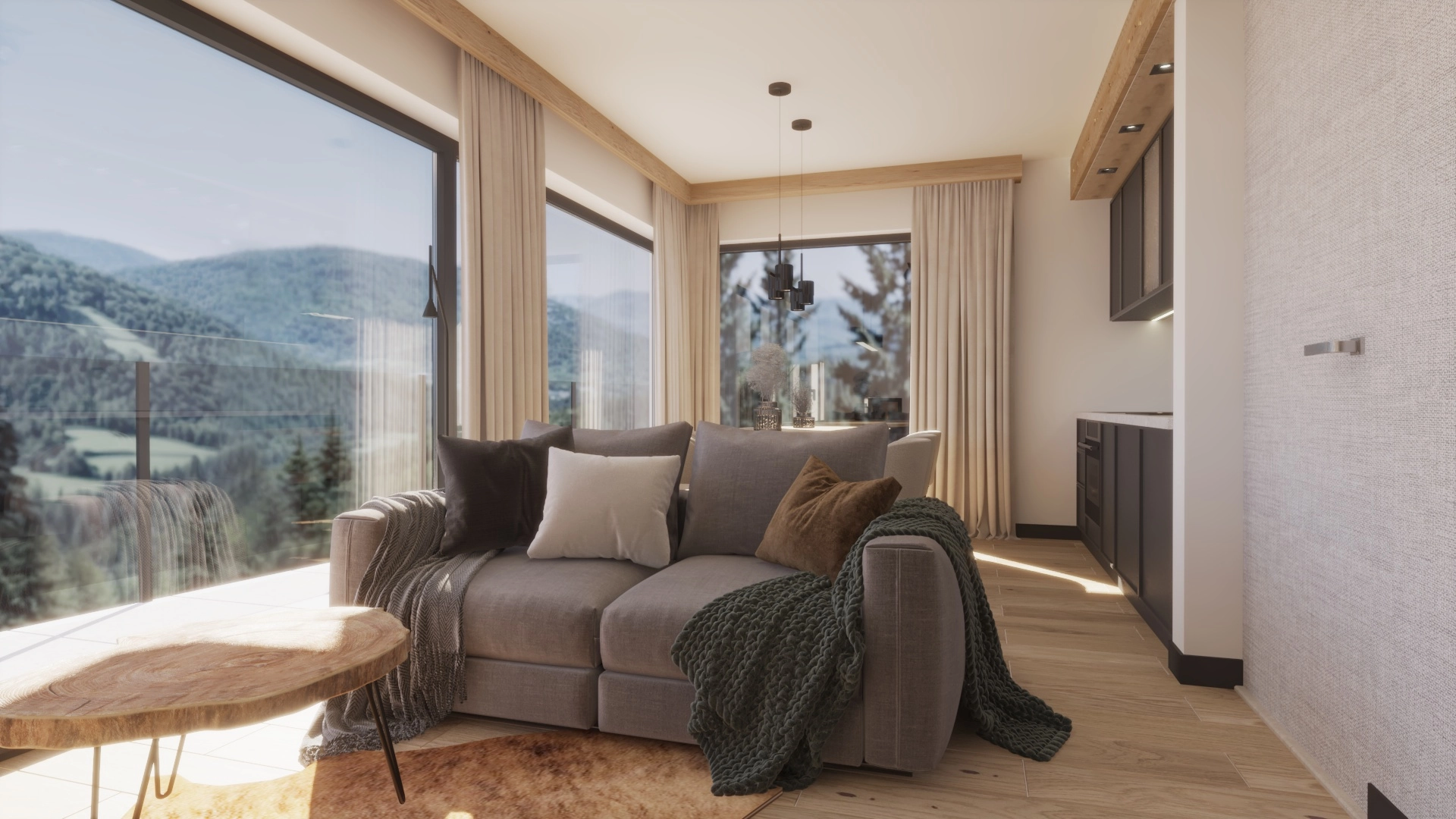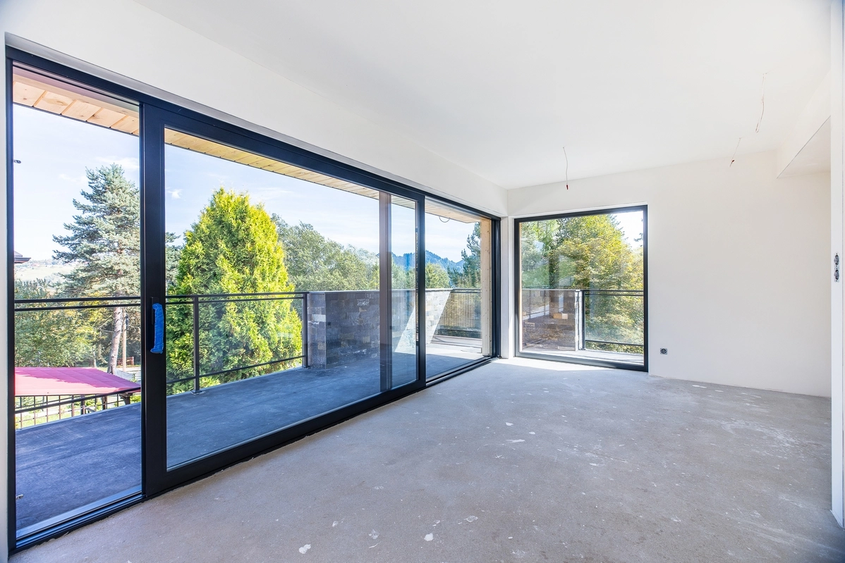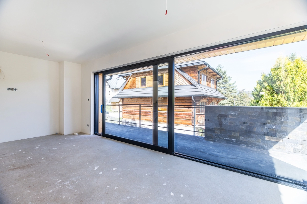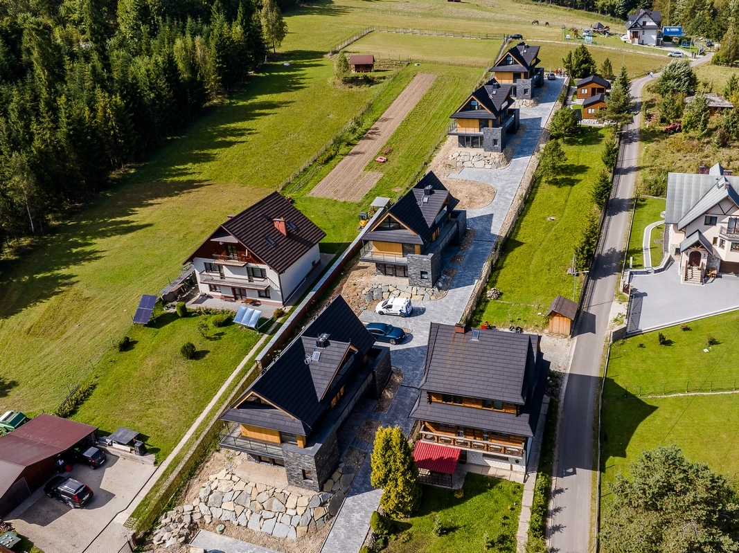 Każdy segment został stworzony z dbałością o detale — elewacja z naturalnego drewna i kamienia, szklane balustrady oraz duże przeszklenia nadają budynkowi elegancki, a jednocześnie ciepły, górski charakter.