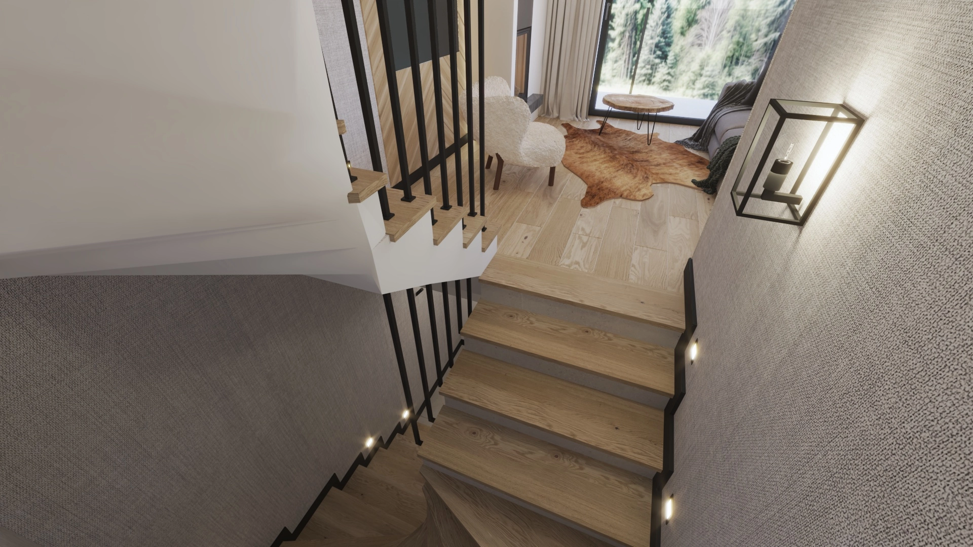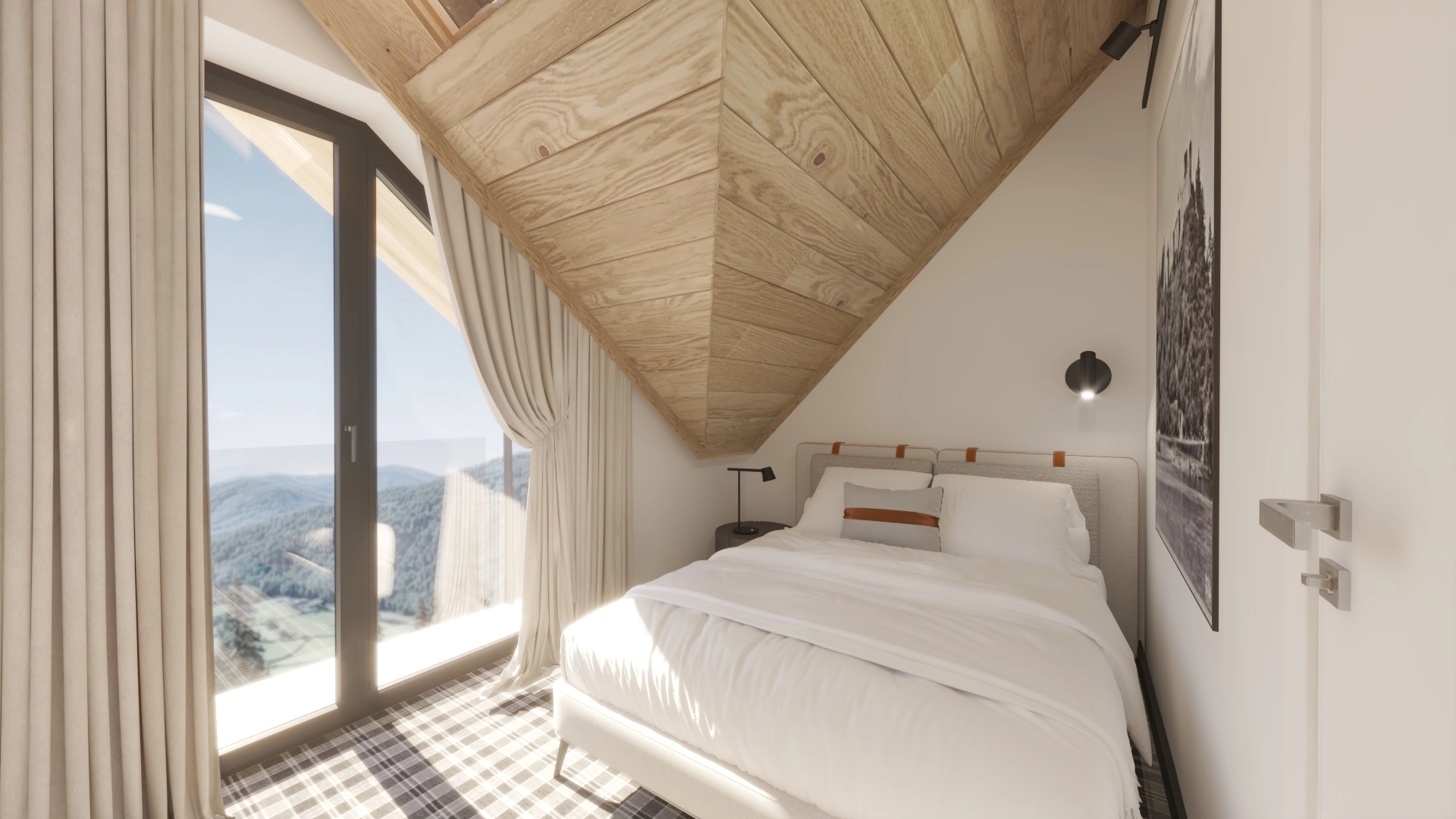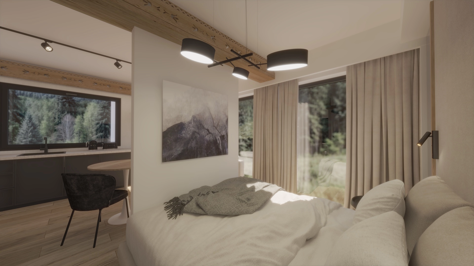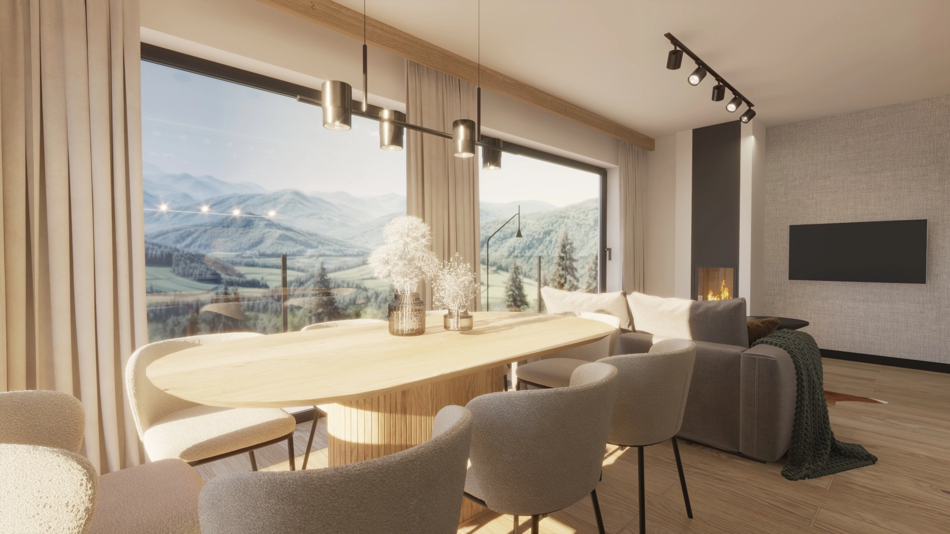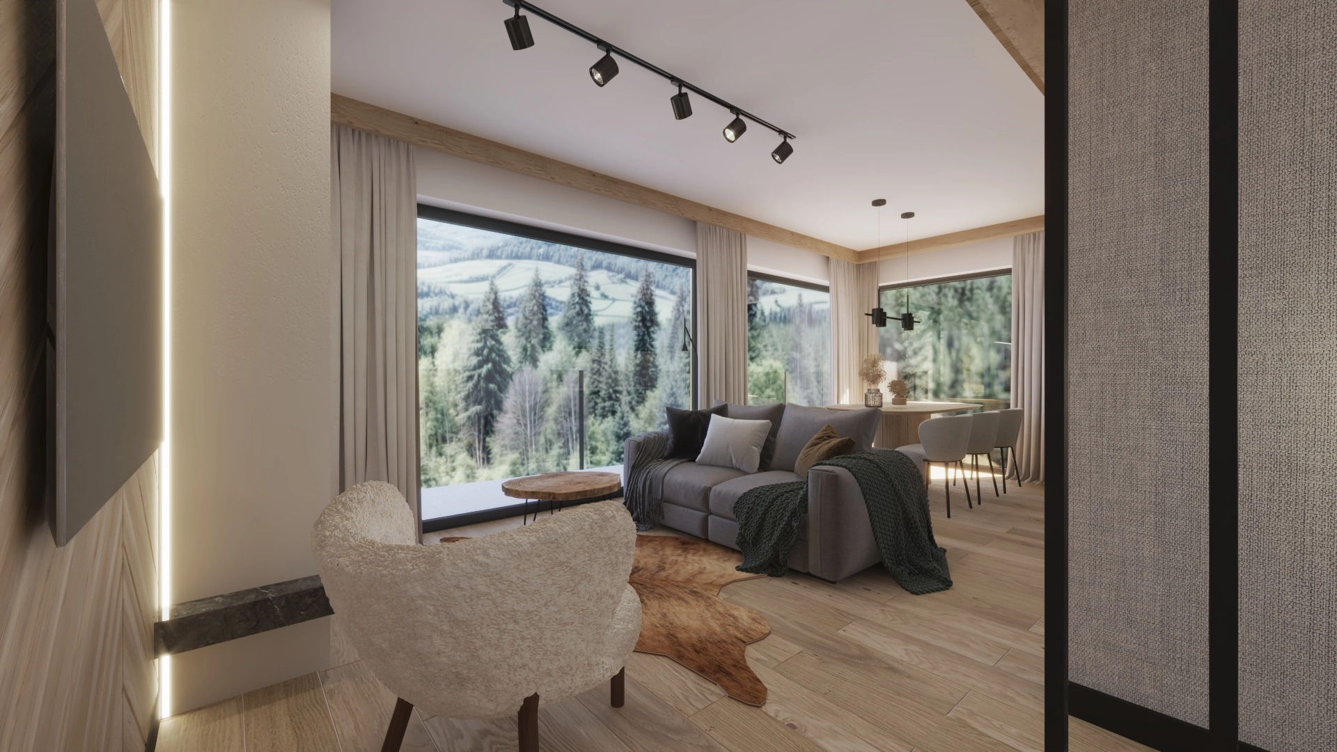 Każdy segment został stworzony z dbałością o detale — elewacja z naturalnego drewna i kamienia, szklane balustrady oraz duże przeszklenia nadają budynkowi elegancki, a jednocześnie ciepły, górski charakter.