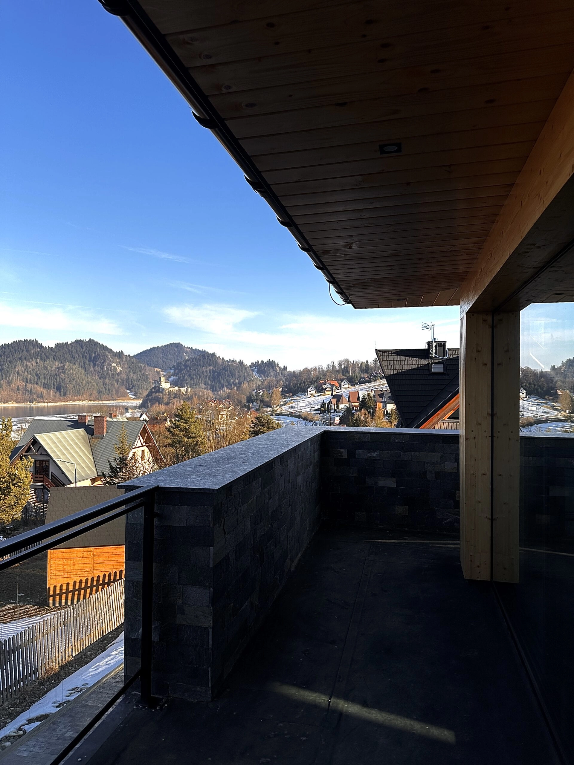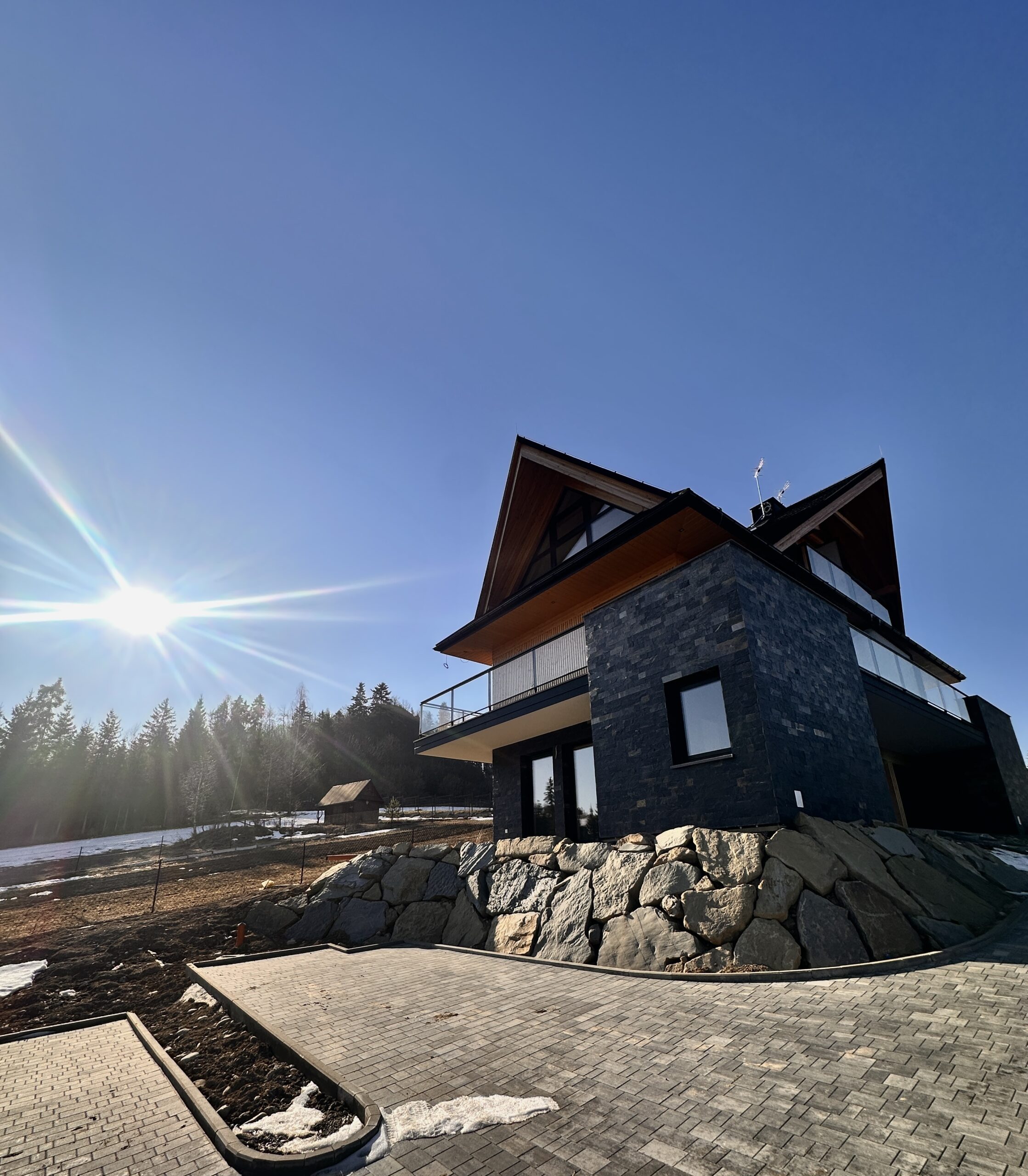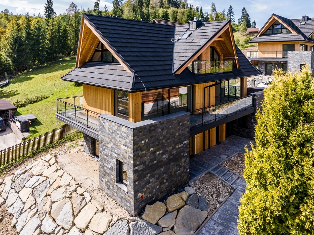 budynek wykonano z trwałych, odpornych na zmienne warunki atmosferyczne materiałów: elewacja z drewna i kamienia, energooszczędne okna z dużymi przeszkleniami i szklanymi balustradami. To nie tylko styl, ale też funkcjonalność i trwałość na lata.