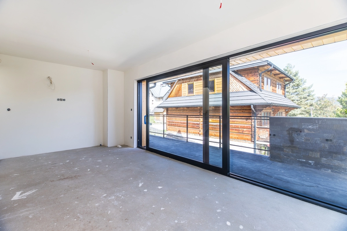 Przestronny dwupoziomowy apartament (ok. 65 m²), składający się z salonu z aneksem kuchennym, 2 sypialni, 2 łazienek oraz balkonu z tarasem, oferującym zachwycające widoki na okoliczne góry i jezioro.